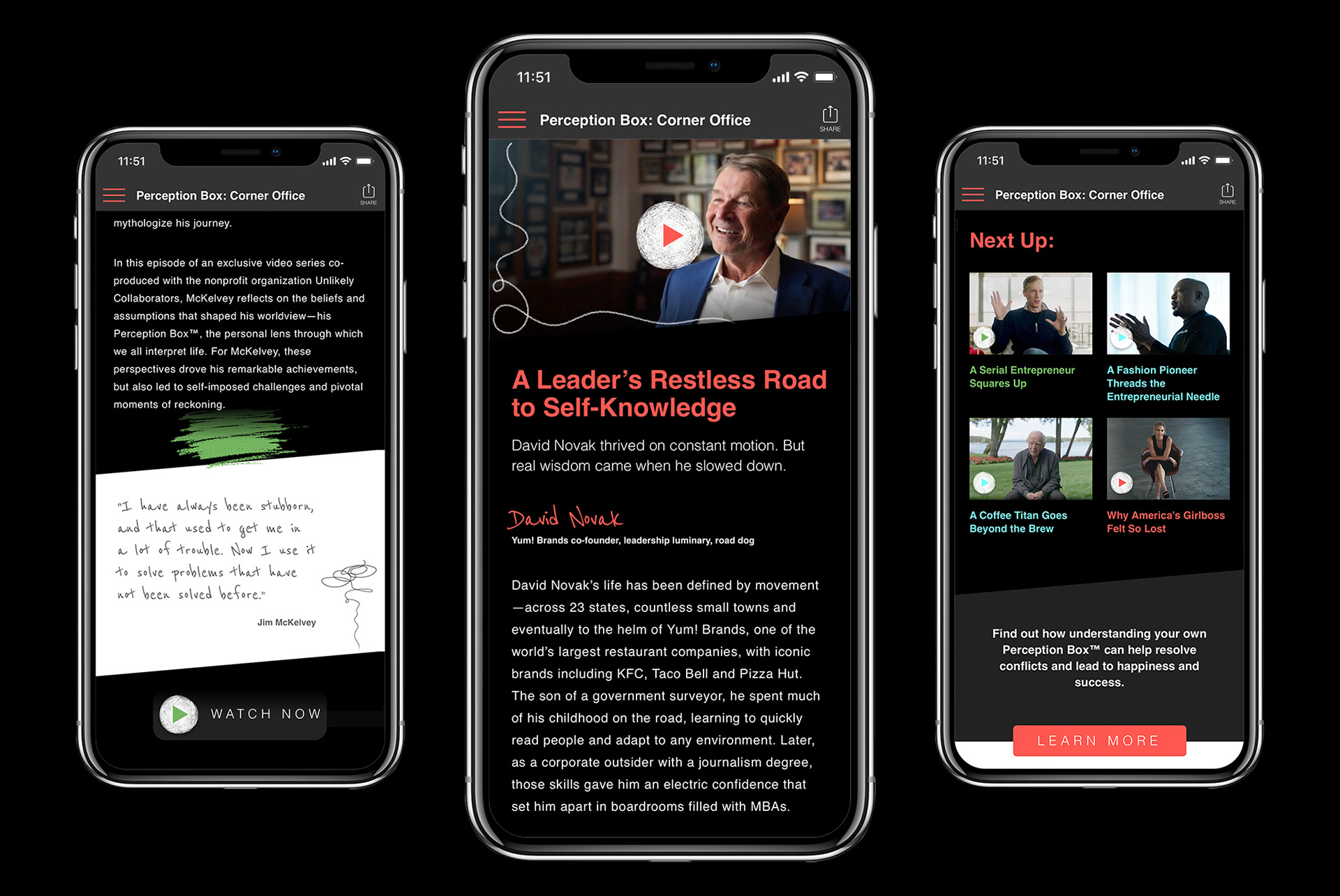 In a media landscape rife with doom scrolling and short attention span, Perception Box: Corner Office stands apart with revelatory and in depth conversations with innovators in business, tech, fashion, and food. Uplifting and raw, the series has been recognized by The Webby, Digiday, Telly, and Shorty Awards.